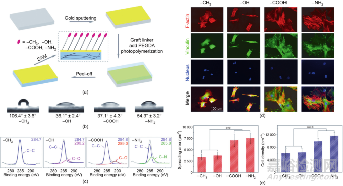 圖4. 材料表面官能團影響細胞黏附和干細胞分化。(a)制備具有4種官能團的聚乙二醇表面,以考察官能團對骨髓間充質(zhì)干細胞的影響。末端官能團分別為—CH3、—OH、—COOH和—NH2;SAM為自組裝單分子膜;PEGDA為聚乙二醇二丙烯酸酯。(b)不同官能團修飾的水凝膠上的接觸角。(c)X射線光電子能譜(XPS)檢測修飾了不同官能團的材料表面上的C1s。(d)骨髓間充質(zhì)干細胞在具有不同官能團的表面上誘導(dǎo)成軟骨9天后,F(xiàn)-肌動蛋白、黏著斑蛋白和細胞核的熒光顯微圖。(e)統(tǒng)計骨髓間充質(zhì)干細胞誘導(dǎo)成軟骨后在不同功能基團表面的鋪展面積和細胞密度(n = 4)。數(shù)據(jù)以均值±標準差表示,用單因素方差分析處理,**表示0.001 < P < 0.01,***表示P < 0.001。
