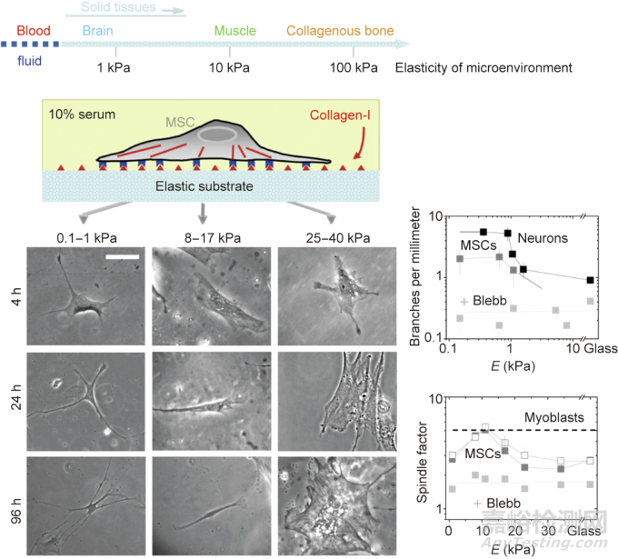 圖5. 基質(zhì)軟硬度調(diào)控干細胞分化的提出。干細胞在不同模量的基質(zhì)上會有不同的分化趨勢。+Blebb指加入Blebbistatin(一種選擇性的非肌球蛋白的細胞滲透性抑制劑),以在一定程度上破壞細胞骨架。