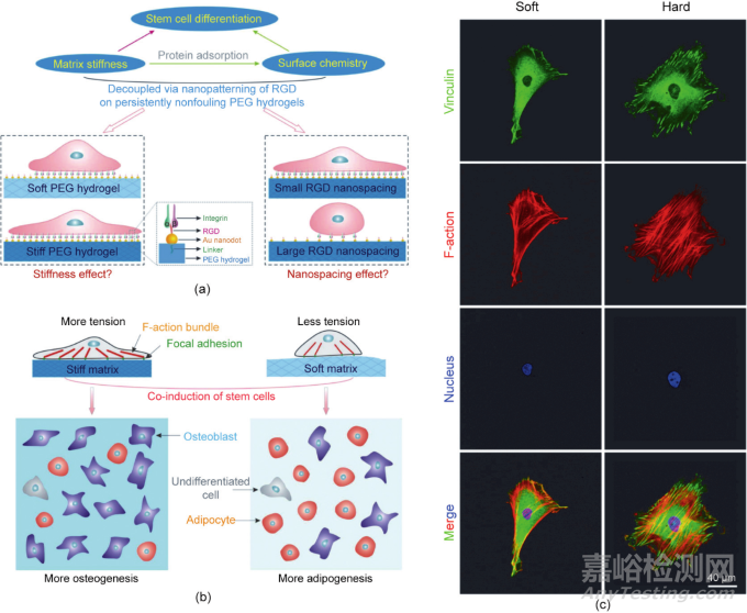 圖6. 基質(zhì)軟硬度調(diào)控干細胞分化的決定性實驗。(a)研究基質(zhì)硬度對干細胞黏附和分化的影響的示意圖。(b)細胞黏附配體的基質(zhì)硬度和納米級空間效應(yīng)直接決定干細胞的命運。(c)RGD納米圖案化的PEG水凝膠上的細胞黏附熒光顯微照片。干細胞在基質(zhì)上黏附24 h,然后免疫熒光染色顯示黏著斑蛋白(綠色)、F-肌動蛋白(紅色)和細胞核(藍色)。