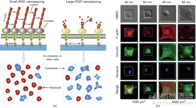 圖7. 基于微納米圖案化表面技術(shù)發(fā)現(xiàn)材料表面RGD黏附多肽的納米間距可以調(diào)控干細胞的特異性黏附和分化。(a)RGD納米間距對干細胞分化的影響;(b)RGD微/納米復(fù)合模式的制備及其干細胞分化的研究。