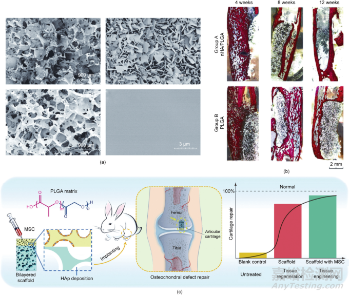 圖8. 基于具有改性內(nèi)表面的多孔支架的組織工程和原位組織再生。(a)含羥基磷灰石涂層的PLGA支架的孔表面的場發(fā)射掃描電子顯微鏡(FE-SEM)圖像(上圖);未經(jīng)處理的PLGA支架的孔表面的FE-SEM圖像(下圖)。(b)骨修復(fù)再生的組織學圖像顯示納米羥基磷灰石涂層的PLGA支架具有較好的成骨能力。(c)PLGA多孔支架再生關(guān)節(jié)軟骨和軟骨下骨的示意圖。
