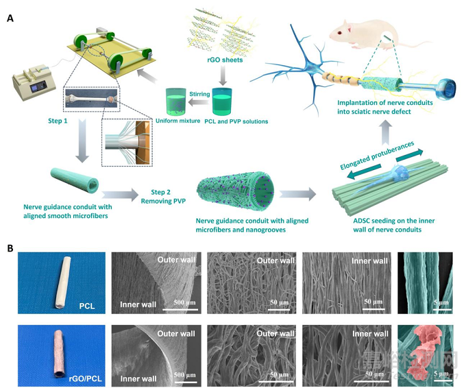 圖1:神經(jīng)導(dǎo)管的制備及表征 . (A) 靜電紡絲rGO/PCL的制備過(guò)程及其體內(nèi)外應(yīng)用的示意圖。(B) 神經(jīng)導(dǎo)管實(shí)拍圖和掃描電鏡圖。神經(jīng)導(dǎo)管外層為雜亂無(wú)章的靜電紡絲纖維,內(nèi)層為取向性排列的纖維(綠色)。纖維表面具有縱向排列的納米溝壑和rGO顆粒(紅色)。