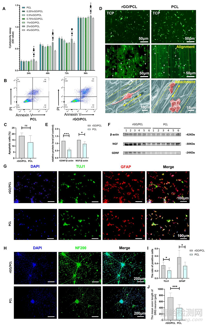 圖2: rGO/PCL和PCL神經(jīng)導(dǎo)管對(duì)脂肪干細(xì)胞的增殖、凋亡、粘附、排列、分化及神經(jīng)營(yíng)養(yǎng)表型的影響。