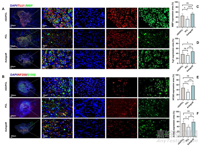 圖3: 神經(jīng)導(dǎo)管植入大鼠體內(nèi)18周后神經(jīng)再生情況. MBP(綠)和S100β (綠)反映了再生神經(jīng)髓鞘化水平,TUJ1(紅)和NF200 (紅)反映了再生神經(jīng)中軸突再生水平。統(tǒng)計(jì)圖可見(jiàn)rGO/PCL導(dǎo)管內(nèi)神經(jīng)再生水平與自體神經(jīng)移植效果類(lèi)似,且顯著高于PCL組。