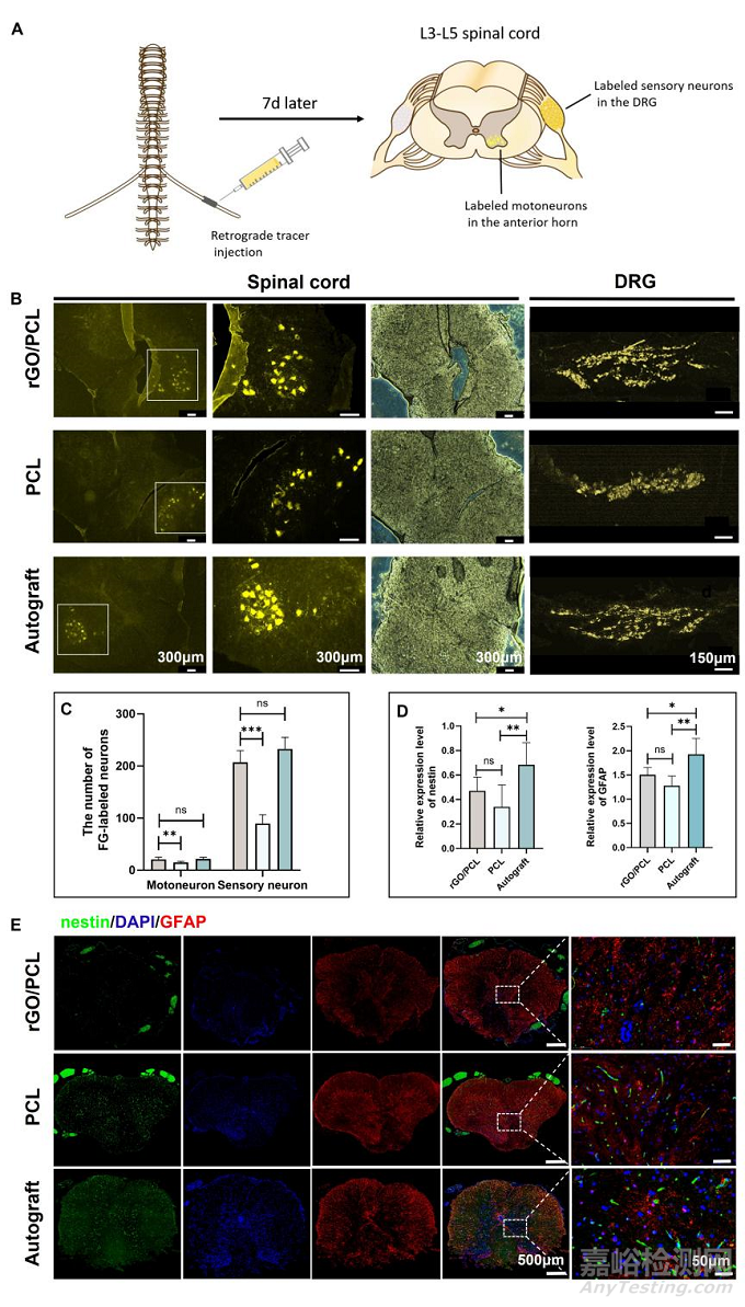 圖4:坐骨神經(jīng)再生水平在上游部位的反饋情況.(A-C)軸突逆行性示蹤劑在脊髓和背根神經(jīng)節(jié)內(nèi)神經(jīng)元胞體的標(biāo)記情況。(D-E)脊髓中再生信號(hào)nestin(綠色)和GFAP(紅色)表達(dá)情況。