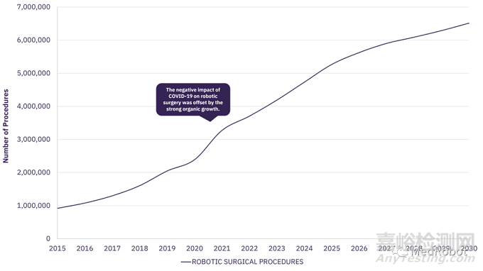 在全球范圍內,使用機器人手術進行的手術數(shù)量在2021年至2030年期間以7.9%的年復合增長率增長。預計到 2030 年,全球手術量將超過 650 萬例。