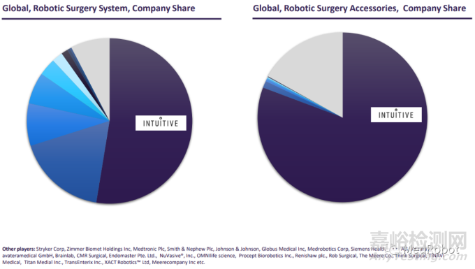 ▲全球手術機器人系統(tǒng)、手術機器人配件公司份額
