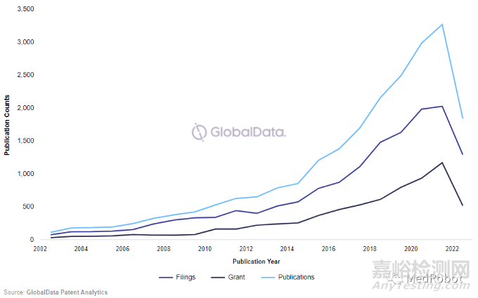 機器人在醫(yī)療中的出現(xiàn)和使用,可以從相關公司申請及獲取授權的相關專利情況中提前預知,跟蹤全球2002年到2022年第一季度的專利申請和授權可以看出相關領域創(chuàng)新能力驚人,醫(yī)療領域機器人專利申請和授權數(shù)量一直呈現(xiàn)出增長趨勢。(備注:本文第1-5部分是手術機器人數(shù)據(jù),本節(jié)的專利來自機器人技術在醫(yī)療領域的數(shù)據(jù)統(tǒng)計,含手術、醫(yī)療服務等)。