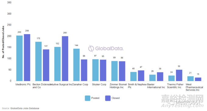在搜索招聘崗位的內容中,含有Robotics相關崗位的前七大公司為美國美敦力、BD公司、直覺外科、丹納赫、史賽克、捷邁邦美、施樂輝。