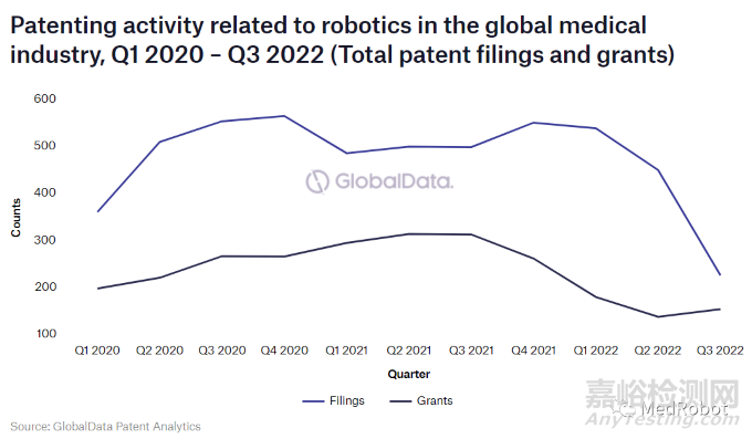 其中2022 年第三季度,統(tǒng)計到的全球醫(yī)療行業(yè)機器人相關專利申請數(shù)量下降了 50%(第二季度450件,第三季度226件),但2022年第三季度與機器人相關的資助總數(shù)增長了 12%。