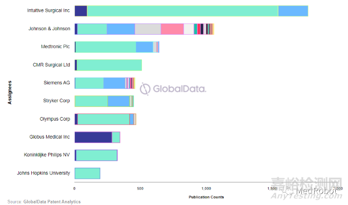 過去20年間,醫(yī)療領域中擁有最多的機器人專利的公司前十名分別為直覺外科、強生、美敦力、CMR、西門子、史賽克、奧林巴斯、Globus Medical、飛利浦和美國約翰霍普金斯大學(JHU有該領域全球排名第一的實驗室)