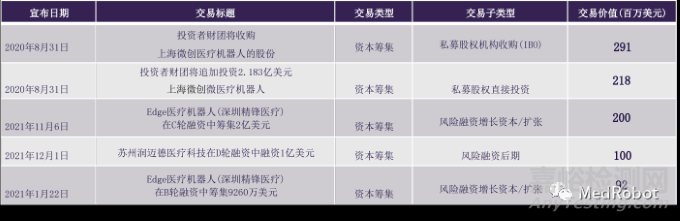 ▲2019-2021年亞太地區(qū)5大手術機器人交易案例
