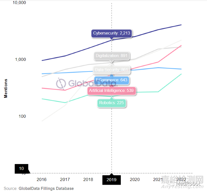 醫(yī)療器械領域數(shù)千家公司及其年度和季度文件中,過去五年提到的技術的情況中,“Cybersecurity網(wǎng)絡安全”、“data security數(shù)據(jù)安全”、“Artificial Intelligence人工智能”、“Digitalization數(shù)字化”和“Robotics機器人”五大關鍵詞整體均呈現(xiàn)出上升趨勢(具體變化趨勢見下圖),整體熱度居高不下。