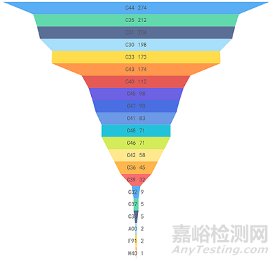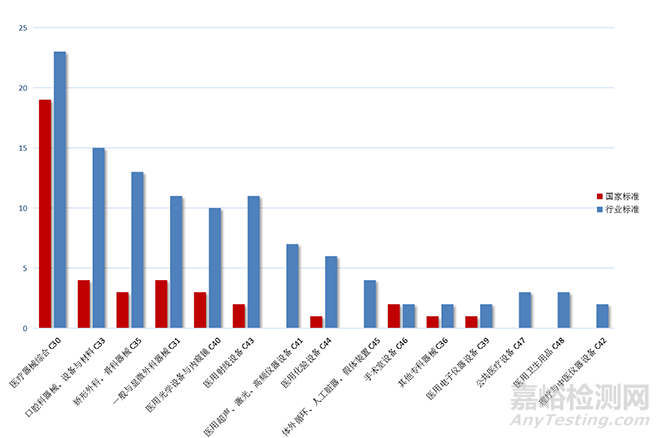 2022年發(fā)布的154項標準中,發(fā)布數(shù)量排名前3的領域分別是醫(yī)療器械綜合(C30)、口腔科器械、設備與材料(C33)、矯形外科、骨科器械(C35),各領域發(fā)布標準數(shù)量見圖7。