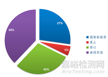 根據(jù)《醫(yī)療器械強制性標準優(yōu)化工作方案》要求,組織完成396項醫(yī)療器械強制性標準和62個在研強制性標準項目優(yōu)化評估。優(yōu)化評估結果為:458項醫(yī)療器械強制性標準和在研項目中,建議轉推薦125項、廢止23項、修訂136項、繼續(xù)有效174項(見圖2)。