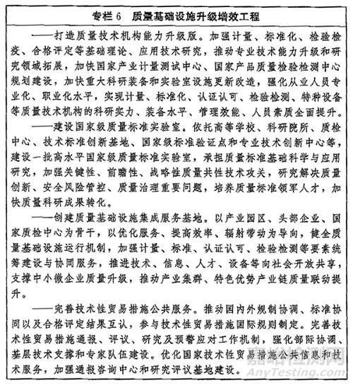 ?。ǘ┘訌?qiáng)質(zhì)量基礎(chǔ)設(shè)施能力建設(shè)。合理布局國家、區(qū)域、產(chǎn)業(yè)質(zhì)量技術(shù)服務(wù)機(jī)構(gòu),建設(shè)系統(tǒng)完備、結(jié)構(gòu)優(yōu)化、高效實(shí)用的質(zhì)量基礎(chǔ)設(shè)施。實(shí)施質(zhì)量基礎(chǔ)設(shè)施能力提升行動(dòng),突破量子化計(jì)量及扁平化量值傳遞關(guān)鍵技術(shù),構(gòu)建標(biāo)準(zhǔn)數(shù)字化平臺(tái),發(fā)展新型標(biāo)準(zhǔn)化服務(wù)工具和模式,加強(qiáng)檢驗(yàn)檢測(cè)技術(shù)與裝備研發(fā),加快認(rèn)證認(rèn)可技術(shù)研究由單一要素向系統(tǒng)性、集成化方向發(fā)展。加快建設(shè)國家級(jí)質(zhì)量標(biāo)準(zhǔn)實(shí)驗(yàn)室,開展先進(jìn)質(zhì)量標(biāo)準(zhǔn)、檢驗(yàn)檢測(cè)方法、高端計(jì)量?jī)x器、檢驗(yàn)檢測(cè)設(shè)備設(shè)施的研制驗(yàn)證。完善檢驗(yàn)檢測(cè)認(rèn)證行業(yè)品牌培育、發(fā)展、保護(hù)機(jī)制,推動(dòng)形成檢驗(yàn)檢測(cè)認(rèn)證知名品牌。加大質(zhì)量基礎(chǔ)設(shè)施能力建設(shè),逐步增加計(jì)量檢定校準(zhǔn)、標(biāo)準(zhǔn)研制與實(shí)施、檢驗(yàn)檢測(cè)認(rèn)證等無形資產(chǎn)投資,鼓勵(lì)社會(huì)各方共同參與質(zhì)量基礎(chǔ)設(shè)施建設(shè)。