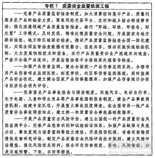 (二十七)優(yōu)化質(zhì)量監(jiān)管效能。健全以“雙隨機(jī)、一公開”監(jiān)管和“互聯(lián)網(wǎng)+監(jiān)管”為基本手段、以重點(diǎn)監(jiān)管為補(bǔ)充、以信用監(jiān)管為基礎(chǔ)的新型監(jiān)管機(jī)制。創(chuàng)新質(zhì)量監(jiān)管方式,完善市場(chǎng)準(zhǔn)入制度,深化工業(yè)產(chǎn)品生產(chǎn)許可證和強(qiáng)制性認(rèn)證制度改革,分類放寬一般工業(yè)產(chǎn)品和服務(wù)業(yè)準(zhǔn)入限制,強(qiáng)化事前事中事后全鏈條監(jiān)管。對(duì)涉及人民群眾身體健康和生命財(cái)產(chǎn)安全、公共安全、生態(tài)環(huán)境安全的產(chǎn)品以及重點(diǎn)服務(wù)領(lǐng)域,依法實(shí)施嚴(yán)格監(jiān)管。完善產(chǎn)品質(zhì)量監(jiān)督抽查制度,加強(qiáng)工業(yè)品和消費(fèi)品質(zhì)量監(jiān)督檢查,推動(dòng)實(shí)現(xiàn)生產(chǎn)流通、線上線下一體化抽查,探索建立全國聯(lián)動(dòng)抽查機(jī)制,對(duì)重點(diǎn)產(chǎn)品實(shí)施全國企業(yè)抽查全覆蓋,強(qiáng)化監(jiān)督抽查結(jié)果處理。建立健全產(chǎn)品質(zhì)量安全風(fēng)險(xiǎn)監(jiān)控機(jī)制,完善產(chǎn)品傷害監(jiān)測(cè)體系,開展質(zhì)量安全風(fēng)險(xiǎn)識(shí)別、評(píng)估和處置。建立健全產(chǎn)品質(zhì)量安全事故強(qiáng)制報(bào)告制度,開展重大質(zhì)量安全事故調(diào)查與處理。健全產(chǎn)品召回管理體制機(jī)制,加強(qiáng)召回技術(shù)支撐,強(qiáng)化缺陷產(chǎn)品召回管理。構(gòu)建重點(diǎn)產(chǎn)品質(zhì)量安全追溯體系,完善質(zhì)量安全追溯標(biāo)準(zhǔn),加強(qiáng)數(shù)據(jù)開放共享,形成來源可查、去向可追、責(zé)任可究的質(zhì)量安全追溯鏈條。加強(qiáng)產(chǎn)品防偽監(jiān)督管理。建立質(zhì)量安全“沙盒監(jiān)管”制度,為新產(chǎn)品新業(yè)態(tài)發(fā)展提供容錯(cuò)糾錯(cuò)空間。加強(qiáng)市場(chǎng)秩序綜合治理,營造公平競(jìng)爭(zhēng)的市場(chǎng)環(huán)境,促進(jìn)質(zhì)量競(jìng)爭(zhēng)、優(yōu)勝劣汰。嚴(yán)格進(jìn)出口商品質(zhì)量安全檢驗(yàn)監(jiān)管,持續(xù)完善進(jìn)出口商品質(zhì)量安全風(fēng)險(xiǎn)預(yù)警和快速反應(yīng)監(jiān)管機(jī)制。加大對(duì)城鄉(xiāng)結(jié)合部、農(nóng)村等重點(diǎn)區(qū)域假冒偽劣的打擊力度。強(qiáng)化網(wǎng)絡(luò)平臺(tái)銷售商品質(zhì)量監(jiān)管,健全跨地區(qū)跨行業(yè)監(jiān)管協(xié)調(diào)聯(lián)動(dòng)機(jī)制,推進(jìn)線上線下一體化監(jiān)管。