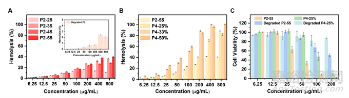 圖6 氨基官能化聚二硫化物 (P2) 和陽離子兩親無規(guī)共聚物 (P4) 的生物相容性。(A) 具有不同 DP 的 P2和降解 P2后的產(chǎn)物(插圖)的溶血結(jié)果 (%)。(B) 具有不同疏水比例的 P4 的溶血結(jié)果 (%)。(C) 用 P2-55、P4-25%、降解的 P2-55 和降解的 P4-25% 處理的 HeLa 細胞的細胞活力 (%)。