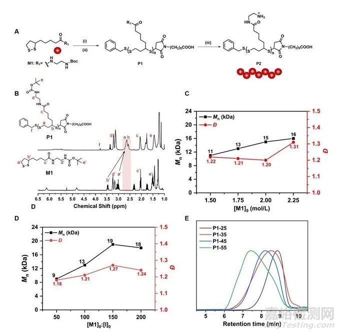圖1. 氨基官能化的聚二硫化物開環(huán)聚合的合成與表征。(A) 合成路線圖;(B) 聚二硫化物1 (P1) 和單體1 (M1) 在CDCl3中的 1H NMR 譜;(C) Mn 和 ? 與初始單體濃度 ([M1]0) 的關(guān)系圖;(D) Mn 和 ? 與單體1和引發(fā)劑的比率 ([M1]0: [I]0) 的關(guān)系圖;(E) 制備型 GPC 純化后,具有不同數(shù)均聚合度的P1的GPC結(jié)果。