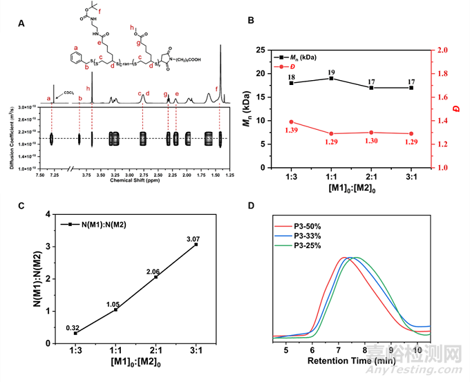 圖2 通過陽離子單體 (M1) 和疏水單體 (M2) 的共聚,合成陽離子疏水兩親聚二硫化物,其陽離子和疏水基團的平衡可通過調(diào)整投料比來控制。(A) 共聚物 P3-50% 的 DOSY NMR 譜圖;(B) Mn 和 ? 與 M1 和 M2 比率([M1]0 : [M2]0) 的關(guān)系圖;(C) 脫保護前共聚物 中 M1 和 M2 的比率與初始投料單體比率([M1]0:[M2]0) 的關(guān)系圖;(D) 制備型 GPC 純化后,具有不同疏水重復(fù)單元比例(50%、33% 和 25%)的共聚物的 GPC 結(jié)果。