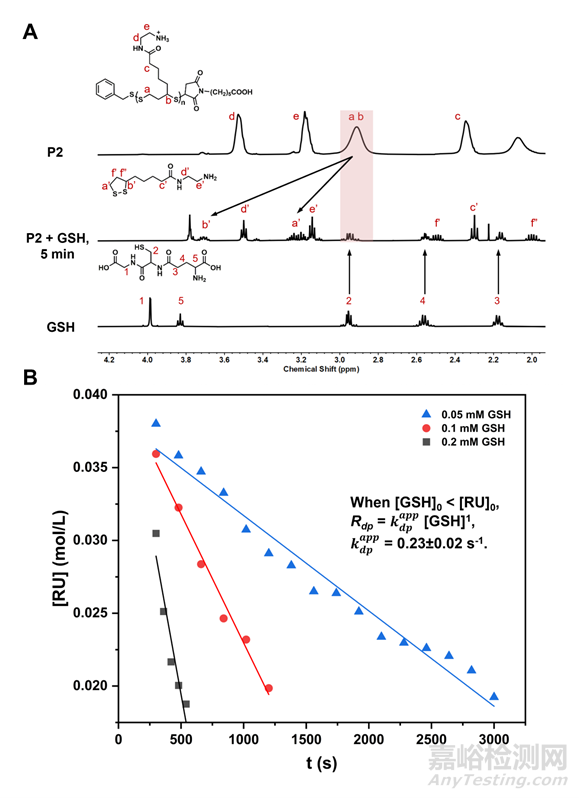 圖3 GSH引發(fā)的聚二硫化物的降解。(A) P2-55在 37 ℃,pH = 5.0 的條件下, GSH 在 D2O 中處理5分鐘前后的 1H NMR 譜圖;(B) P2-45與不同濃度的 GSH 在 37 ℃, pH = 7.0 的條件下聚合物解聚的散點圖。