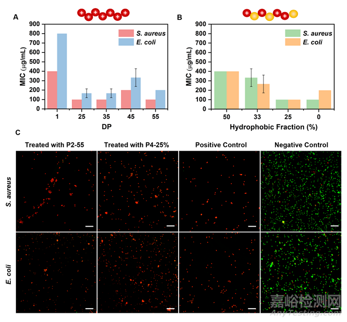 圖4 氨基官能化聚二硫化物(P2)和陽離子兩親性無規(guī)共聚物(P4)的抗菌活性。(A) 具有不同 DP 的 P2 的 MIC結(jié)果。DP = 1 表示 P2 的降解產(chǎn)物;(B) 具有不同疏水基團比例的P4 的 MIC結(jié)果;(C) 用 P2-55 或 P4-25% (2× MIC) 處理 2 小時,然后進行活/死染色(合并)的金黃色葡萄球菌和大腸桿菌的熒光共聚焦圖像。SYTO 9 染色劑(綠色熒光)通常標(biāo)記膜完整的細菌(活細菌),而碘化丙啶(PI,紅色熒光)僅穿透膜受損的細菌(死細菌)。