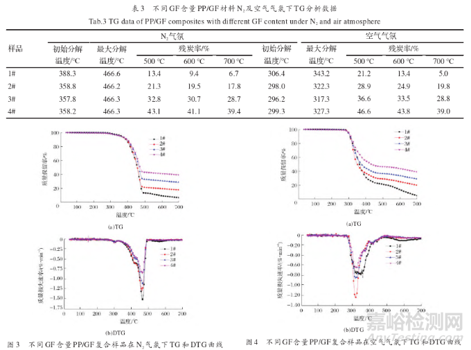 GF加入高分子材料后,提高材料的各種物理性能,如尺寸穩(wěn)定性、熱變形溫度等。而TG分析可以得到高分子材料在無(wú)氧或者有氧條件下的各種熱分解參數(shù),對(duì)研究材料的阻燃機(jī)理具有重要的作用。