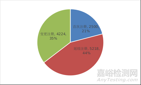 按照注冊(cè)形式區(qū)分,首次注冊(cè)2500項(xiàng),占全部醫(yī)療器械注冊(cè)數(shù)量的20.9%;延續(xù)注冊(cè)5218項(xiàng),占全部醫(yī)療器械注冊(cè)數(shù)量的43.7%;變更注冊(cè)4224項(xiàng),占全部醫(yī)療器械注冊(cè)數(shù)量的35.4%。注冊(cè)形式比例情況見(jiàn)圖6。