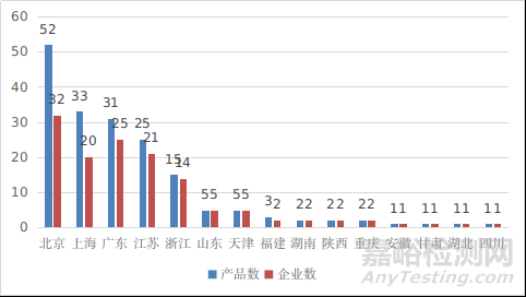 圖16 境內(nèi)創(chuàng)新醫(yī)療器械注冊(cè)省份排位圖(藍(lán)色:產(chǎn)品數(shù)量,紅色:企業(yè)數(shù)量)