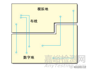 在實(shí)際工作中一般傾向于使用統(tǒng)一地,而將PCB分區(qū)為模擬部分和數(shù)字部分。模擬信號(hào)在電路板所有層的模擬區(qū)內(nèi)布線,而數(shù)字信號(hào)在數(shù)字電路區(qū)內(nèi)布線。在這種情況下,數(shù)字信號(hào)返回電流不會(huì)流入到模擬信號(hào)的地。
