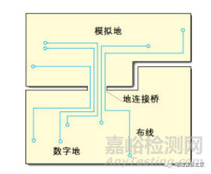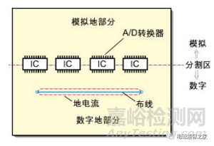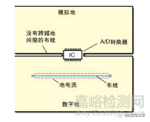 如果系統(tǒng)僅有一個(gè)A/D轉(zhuǎn)換器,上面的問題就很容易解決。如圖3中所示,將地分割開,在A/D轉(zhuǎn)換器下面把模擬地和數(shù)字地部分連接在一起。采取該方法時(shí),必須保證兩個(gè)地之間的連接橋?qū)挾扰cIC等寬,并且任何信號(hào)線都不能跨越分割間隙。