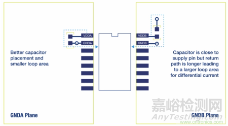 圖7比較了旁路電容器的理想位置和非理想位置 資料來源:Silicon Labs