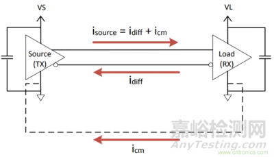 圖2平衡差分信號系統(tǒng)中顯示的共模電流。資料來源:Silicon Labs