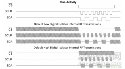 圖4對于所示的總線傳輸,默認(rèn)的高數(shù)字隔離器具有較少的內(nèi)部RF傳輸。資料來源:Silicon Labs