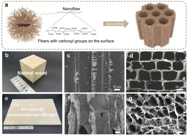 圖1.全天然氣凝膠的制備與結(jié)構(gòu)。(a)木屑顆粒表面納米化和仿木結(jié)構(gòu)構(gòu)造過(guò)程示意圖;(b-d)天然木材及其取向通道結(jié)構(gòu);(e-g)全天然海綿及其取向通道結(jié)構(gòu)。
