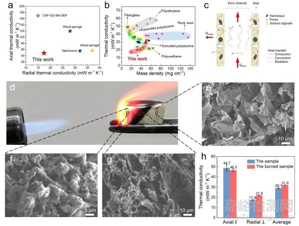研究人員運(yùn)用巧妙的表面化學(xué)調(diào)控方法,實(shí)現(xiàn)了在溫和條件下活化微米尺度的木屑顆粒表面,從而暴露出纖維素納米纖維(圖1a)。這些顆粒表面的納米纖維顯著增強(qiáng)了顆粒之間的相互作用,結(jié)合單向冷凍技術(shù)構(gòu)建了強(qiáng)韌耐用的仿木氣凝膠。這種氣凝膠有著與天然木材類(lèi)似的取向通道結(jié)構(gòu)(圖1b-g),同時(shí),這種仿木結(jié)構(gòu)可以降低氣凝膠的熱導(dǎo)率,使其具有17.4 mW m-1K-1的超低徑向熱導(dǎo)率,優(yōu)于現(xiàn)有纖維素基氣凝膠材料和各類(lèi)商用海綿(圖2a-c)。此外,加入天然粘土納米片使得這種氣凝膠的耐火性能有了較大改善,可承受1300℃高溫的火焰至少20分鐘而不被燒透(圖2d-h)。