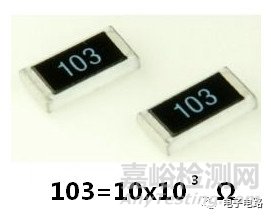 (4)數(shù)碼表示法。數(shù)碼表示法是指用三位數(shù)字表示電阻的標(biāo)稱阻值。數(shù)碼從左到右,前兩位為有效數(shù),第三位為乘數(shù),即10的N次方,通常以Ω為單位。如電阻上標(biāo)為103,則阻值為10x103Ω,注:若第三位數(shù)為9,則表示乘數(shù)為10-1。