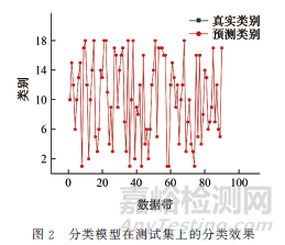 由圖1可知,隨著迭代次數(shù)的增加,準(zhǔn)確率逐漸趨近于100%,證明利用神經(jīng)網(wǎng)絡(luò)進(jìn)行分類(lèi)具有一定的可行性。用訓(xùn)練好的神經(jīng)網(wǎng)絡(luò)對(duì)測(cè)試集樣品進(jìn)行分類(lèi),分類(lèi)效果如圖2所示。