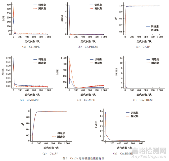 按照試驗(yàn)方法對(duì)訓(xùn)練集進(jìn)行訓(xùn)練,各元素定標(biāo)模型的4個(gè)性能指標(biāo)隨迭代次數(shù)變化而變化,其中Cr、Cu定標(biāo)模型性能指標(biāo)的變化曲線如圖3所示。