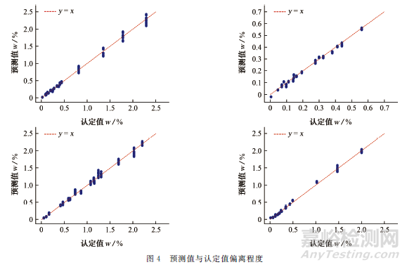 通過(guò)試驗(yàn)發(fā)現(xiàn),測(cè)試集中5種元素也保持了良好的擬合效果,RMSE、MPE和PRESS等3項(xiàng)指標(biāo)也較好,充分說(shuō)明利用BP神經(jīng)網(wǎng)絡(luò)建立的元素定標(biāo)模型的性能較好。根據(jù)圖4可以表明,各元素模型的預(yù)測(cè)值均在認(rèn)定值范圍內(nèi)浮動(dòng),擬合程度較好,能夠反映元素的真實(shí)含量。