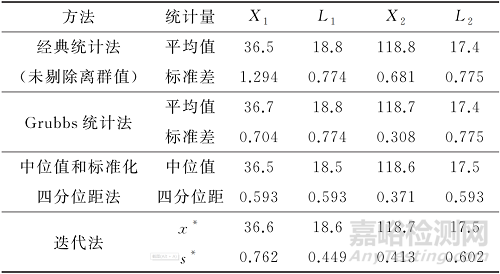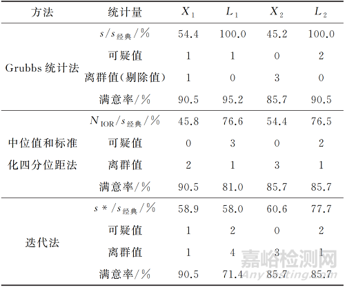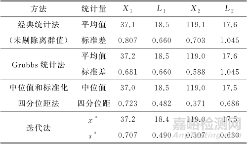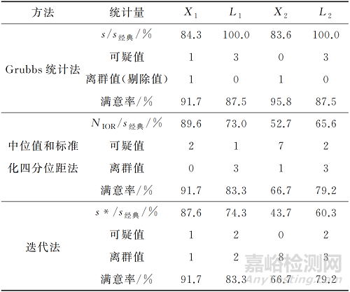 應(yīng)用中位值和標準化四分位距法和迭代法這兩種穩(wěn)健統(tǒng)計法進行統(tǒng)計后,8組數(shù)據(jù)的指定值相較于經(jīng)典統(tǒng)計法均發(fā)生了偏移,而能力驗證評定標準差相應(yīng)減小。在4組剔除異常結(jié)果的數(shù)據(jù)中,將兩種穩(wěn)健統(tǒng)計法與格拉布斯統(tǒng)計法的結(jié)果進行對比發(fā)現(xiàn),迭代法與格拉布斯統(tǒng)計法的指定值更接近,相對于經(jīng)典統(tǒng)計法結(jié)果均發(fā)生了同方向的偏移;中位值和標準化四分位距法的指定值未發(fā)生偏移,而2019-X1(表示2019年的數(shù)據(jù)L1,其余類比)指定值的偏移方向與格拉布斯統(tǒng)計法的相反,其余兩組的偏移方向與格拉布斯統(tǒng)計法的相同。經(jīng)過比較,在出現(xiàn)較為明顯的異常結(jié)果時,迭代法得到的指定值準確性更高。