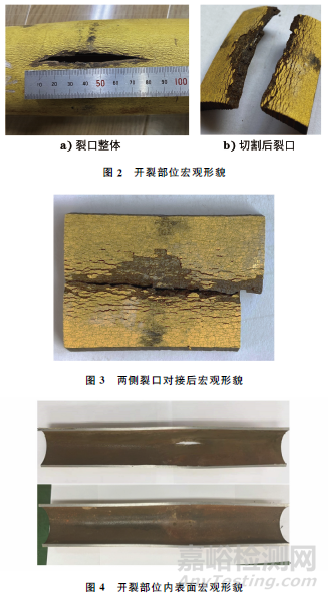 開裂管道規(guī)格為76mm×5mm(外徑×壁厚),送檢的管段長度為930mm,開裂處位于管段中部,沿縱向開裂,開裂口縱向長度為80mm,最大張開寬度為7mm,開裂處存在輕微鼓脹變形(見圖1),并可見壁厚減薄,且呈45°剪切特征(見圖2)。裂口周圍的防腐層破損脫落,其余部位的防腐層呈龜裂形貌。因裂口兩側(cè)管體發(fā)生塑性變形,故兩側(cè)斷口無法完全對接(見圖3)。將開裂部位的管體縱向剖開,發(fā)現(xiàn)管體內(nèi)表面呈紅褐色,有均勻的腐蝕形貌(見圖4)。