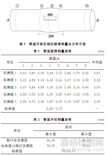 使用超聲波測厚儀對開裂管道的壁厚進(jìn)行測量。管道開裂區(qū)域的壁厚測量點如圖5所示,由A~B端取5個剖面進(jìn)行壁厚測量,每個剖面沿周向取8個測量點,測量結(jié)果如表1所示。由表1可知:遠(yuǎn)離開裂部位的管道平均壁厚為5.52~5.67mm,最小壁厚為5.36 mm。開裂所在的鼓脹區(qū)平均壁厚為5.00~5.15mm,最小壁厚為4.62mm。分別測量管體鼓脹區(qū)及遠(yuǎn)離開裂部位管道的外徑,結(jié)果如表2所示。管道壁厚及管徑測量結(jié)果表明,裂口位置發(fā)生了明顯的塑性變形及壁厚減薄。