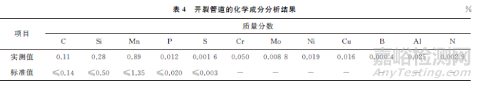 依據(jù)ASTM A751-14a《鋼制品化學(xué)分析標(biāo)準(zhǔn)試驗方法、試驗操作和術(shù)語》,采用直讀光譜儀及TC600型氧氮分析儀對遠(yuǎn)離開裂部位的管道進(jìn)行化學(xué)成分分析,結(jié)果如表4所示。由表4可知,管道的化學(xué)成分均符合GB/T 9711—2017《石油天然氣工業(yè) 管線輸送系統(tǒng)用鋼管》要求。