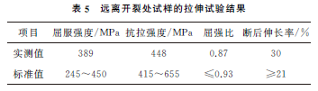 從遠(yuǎn)離開裂部位的管道上截取試樣,在材料試驗機上進(jìn)行拉伸試驗,結(jié)果如表5所示。試樣的拉伸試驗結(jié)果符合GB/T 9711—2017標(biāo)準(zhǔn)要求。