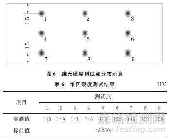 從遠(yuǎn)離開裂部位的管道處截取試樣,使用維氏硬度計測試管道的維氏硬度,在試樣外表面、中間、內(nèi)表面3個部分分別測試3個點(見圖6),測試結(jié)果如表6所示。硬度測試結(jié)果表明:材料硬度符合GB/T 9711—2017標(biāo)準(zhǔn)要求。