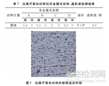 從遠(yuǎn)離開裂部位的管道上截取試樣,依據(jù)ASTM E3-11(2017) 《金相試樣制備標(biāo)準(zhǔn)指南》,ASTM E45-18a 《鋼中夾雜物含量的測定———標(biāo)準(zhǔn)檢驗法》,ASTM E112-13 《平均晶粒度測定的標(biāo)準(zhǔn)試驗方法》,用光學(xué)顯微鏡觀察試樣,結(jié)果如表7(表中F為鐵素體,P為珠光體)及圖7所示。