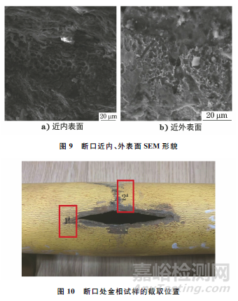 管體開裂部位經(jīng)超聲波清洗后觀察兩側(cè)斷口,其宏觀形貌如圖8所示。由圖8可知,原始斷口處厚度有明顯減薄,斷面為紅褐色,表面覆蓋了一層較厚的腐蝕產(chǎn)物。對剪切唇一側(cè)斷口用乙醇清洗并觀察斷面,發(fā)現(xiàn)其為典型的45°剪切斷口,斷口表面呈纖維狀;斷口內(nèi)未發(fā)現(xiàn)特征花樣及裂紋源區(qū)。