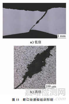 從斷口處截取試樣(見圖10),依據(jù)ASTM E3-11(2017)進(jìn)行金相檢驗,結(jié)果表明試樣斷口處顯微組織沿周向拉伸變形,組織均為F+P(見圖11)。