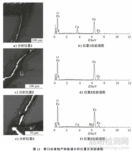 對開裂斷口處的腐蝕產(chǎn)物進(jìn)行能譜分析,其主要成分有Fe、C、O、Ca、Mn元素等(見圖12)。